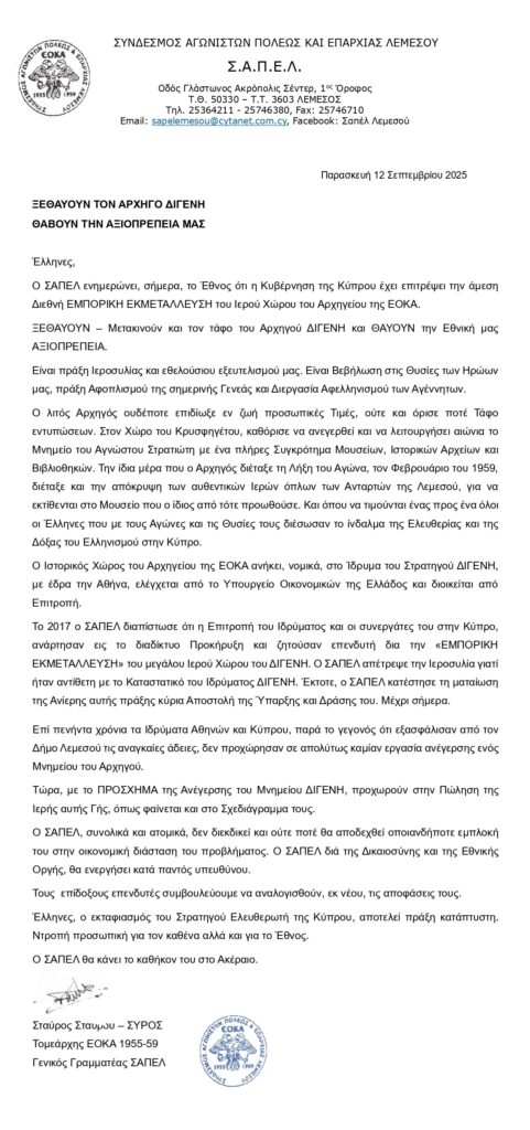 Σας παραθέτουμε την ανακοίνωση του ΣΕΠΑΕΛ [Συνδέσμου Αγωνιστών Πόλεως και Επαρχίας Λεμεσού] που φέρει την υπογραφή του αγωνιστή Σταύρου Σταύρου -Σύρου, τομεάρχη της ΕΟΚΑ, για το μείζον αυτό θέμα: