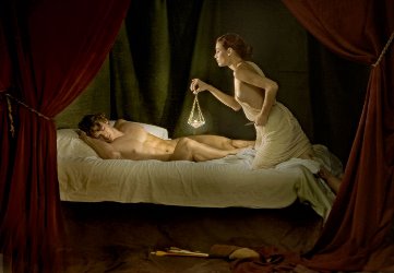 Την τρίτη φορά που συναντήθηκαν, οι αδελφές της έπεισαν την Ψυχή πως ο γαμπρός στην πραγματικότητα ήταν ένα απαίσιο τέρας, το οποίο θα την σκότωνε αμέσως μόλις εκείνη γεννούσε τον απόγονό του. Την τρόμαξαν τόσο πολύ, ώστε πείστηκε να τον σκοτώσει πρώτη εκείνη. Τη νύχτα, μόλις ο σύζυγός της κοιμήθηκε, η Ψυχή πλησίασε κρατώντας ένα λυχνάρι στο ένα χέρι και μία λάμα στο άλλο. Πλησιάζοντας όμως είδε το πρόσωπο του και διαπίστωσε πως την είχε αγαπήσει ο πιο όμορφος κι αξιαγάπητος από τους θεούς! Ήταν ο γιος της Αφροδίτης, ο ίδιος ο Έρως! Κι ενώ στεκόταν αποσβολωμένη εκεί και χάζευε τον όμορφο νέο, είδε τη φαρέτρα και τα βέλη του ακουμπισμένα δίπλα από το κρεβάτι. Πήρε ένα βέλος και το περιεργαζόταν με θαυμασμό, όταν η αιχμή της τρύπησε το χέρι. Και τότε, η δύστυχη κοπέλα έχασε το μυαλό της! Ερωτεύτηκε τον Έρωτα με πάθος ανεξέλεγκτο. Τόση ήταν η ταραχή της, που έγειρε το λυχνάρι και χύθηκε μία σταγόνα καυτό λάδι στον ώμο του. Ο Έρωτας ξύπνησε, θύμωσε που εκείνη δεν τον εμπιστεύτηκε και εξαφανίστηκε.
